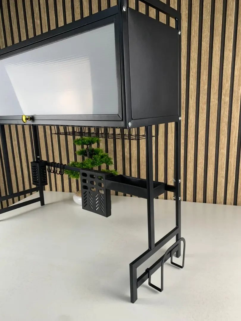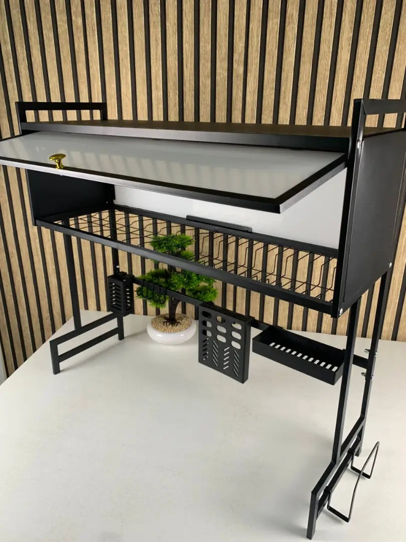 منشّف الأطباق المصمم للتركيب فوق الحوض يتميز بتصميم متعدد الوظائف يلبي مختلف احتياجات التخزين في المطبخ. مصنوع من الفولاذ المقاوم للصدأ عالي الجودة مع طلاء أسود ناعم، يتمتع بمتانة ممتازة ومقاومة عالية للصدأ، ما يضمن عمر استخدام طويل ويجعله قطعة أساسية في كل مطبخ.