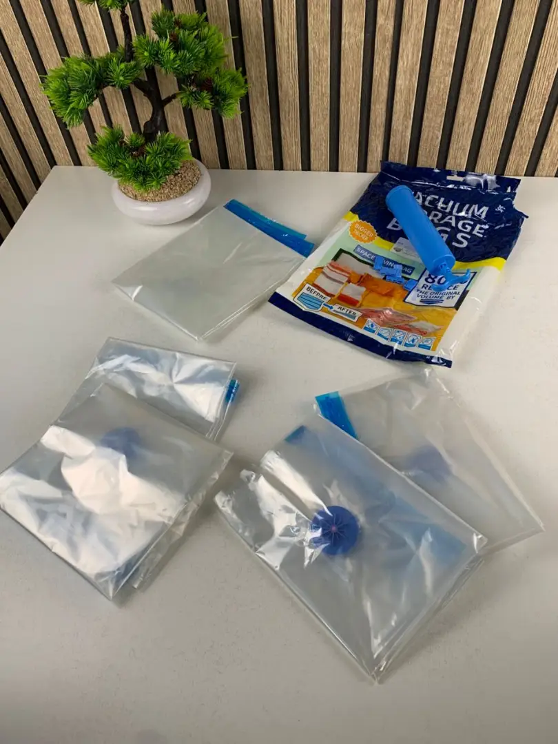 مع مجموعة الأكياس المفرغة من الهواء (Vacuum Bags)، أصبح تنظيم منزلك وتوفير المساحة أسهل من أي وقت مضى. مثالية لترتيب الخزائن، حماية الملابس من الغبار، أو التحضير للسفر والعطل! 🏠✈️